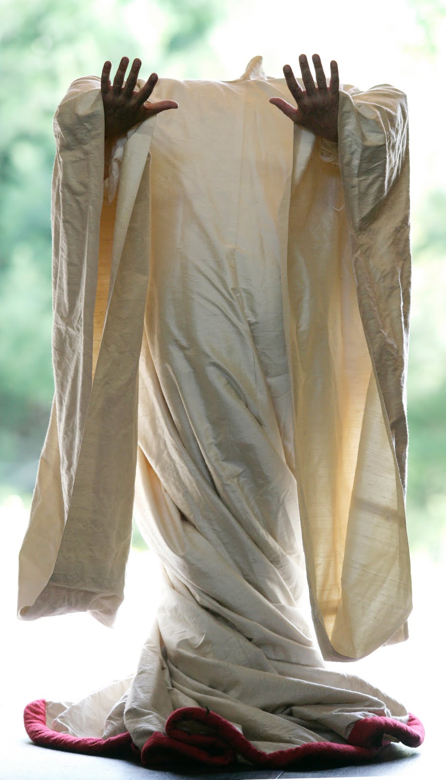 I don’t look at it as self-quoting or even repetition but of investigation and thematic development. The original tube dresses are the silhouette of the bottom half of a Japanese kimono. I love the simple and elegant lines that they provide and the negative space that they create in a black box setting. We see just the arms, head and feet if we choose. I used them in conjunction with Mahler songs at the beginning of the research cycle (probably three or four years) and then mostly used them for creations at LADMMI [L’école de danse contemporaine] where I have created at least five to seven works with tubes and objects. Lately I have been working with five-foot squares of material (It started, again, at Le Groupe Dance Lab and continued at STDT [School of Toronto Dance Theatre], in my solo REDD, with Old Men Dancing in Peterborough, at LADMMI (most recently with tube dresses) and in a new solo for Yvonne Ng.) The balancing of objects in my work started in the late eighties with balls painted like globes and balanced on the eye sockets of the dancers in the work Blind Angel. I have continued to investigate this idea since then. I found that I liked to watch what the body did when it was doing something functional, something other than “dancing”. I played with the subtleness of whether the body was supporting the object, usually a grapefruit, or hanging from it. In workshops it brought out ways of teaching subtlety and sensitivity in a gentle and profound way: “you” have to disappear from the performance in order for the grapefruit to balance. I refer to it as minimal circus as there is not a real risk but those watching do tend to empathize with the body balancing and feel the precariousness of the situation. Before the grapefruit workshops, I ran workshops called, “If you think you are dancing … you are not! You are thinking!” The Grapefruit workshops were an extension and explanation of the previous workshops.